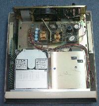 Inside the Altos 586. With the top cover removed we can see the hard and floppy drives, and the power supply. Remove two screws from the rear panel, and the unit opens up with a unique clamshell design to reveal the main control board (with a memory expansion card installed). Under the top half, are two more optional I/O boards.