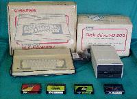drive. Several cartridges, TRS-80 CoCo2 with Tandy dust cover and FD-500 disk