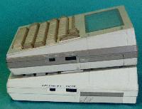 The TRS-80 Model 100 and the NEC 8201A/8300 are examples of a series of battery powered powertable computers based on a common design by Kyocera. These were the first truly portable computers, and were released in 1983. The NEC machines contained a BASIC interpreter, text editor and telecom application. The TRS-80 Model 100 added an address boock and scheduler.